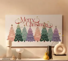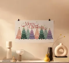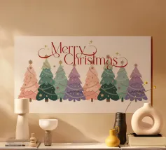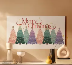 Fila di alberi di Natale pastello con scritta "Merry Christmas".