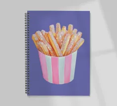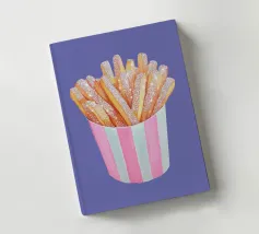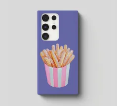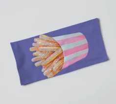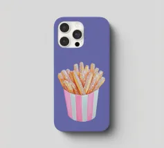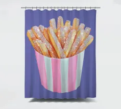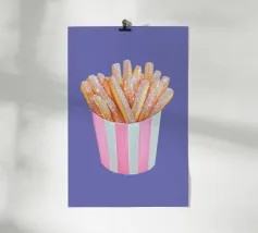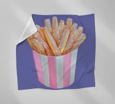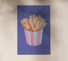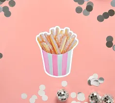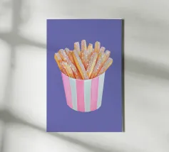 È possibile cambiare il colore dello sfondo. Un'opera d'arte stravagante con patatine fritte scintillanti in una tazza a righe bianche e rosa. Divertente e scintillante, questo pezzo aggiunge un tocco al familiare comfort food.