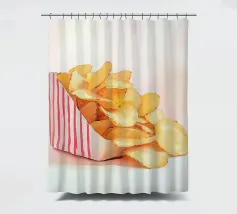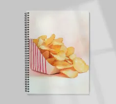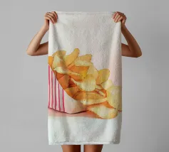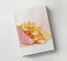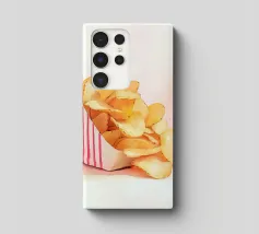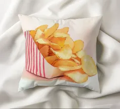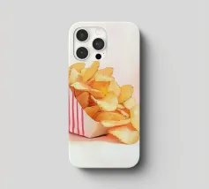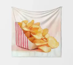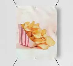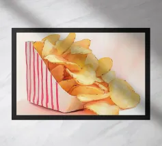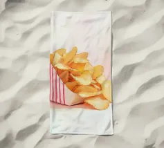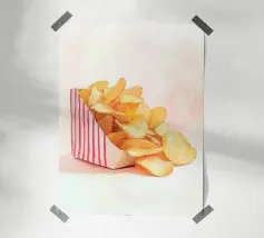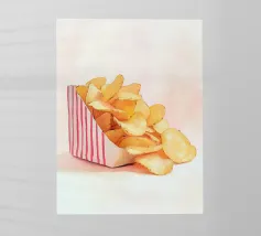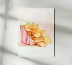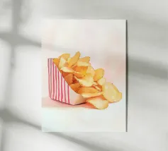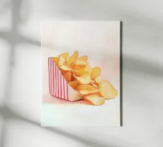 Questa affascinante illustrazione di patatine in una scatola a strisce rosa pastello cattura il nostalgico look retrò del popolare snack. Con pennellate morbide e una tavolozza di colori armoniosa, l'opera d'arte trasmette una cultura alimentare giocosa e trasforma il fast food in arte culinaria creativa.
