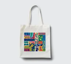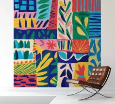 Un audace ed energico patchwork di foglie e motivi astratti della giungla in stile fauvista. I vibranti blu, verdi e gialli creano una composizione botanica dinamica e ricca di texture.