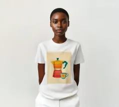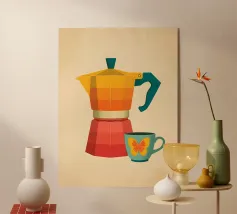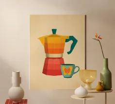Una vibrante celebrazione della cultura del caffè, questa opera d'arte cattura l'essenza del perfetto rituale mattutino. Con una caffettiera d'ispirazione rétro nelle vivaci tonalità dell'arancione e del rosa, abbinata a una tazza giocosa, è una lettera d'amore visiva agli amanti del caffè di tutto il mondo. I toni caldi e il design stravagante invitano ad assaporare ogni sorso. Perfetto per aggiungere un tocco di colore e personalità a qualsiasi spazio, questo pezzo è un must per chi non può iniziare la giornata senza la sua indispensabile tazza di caffè.