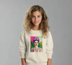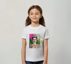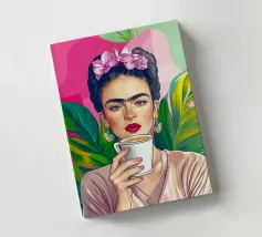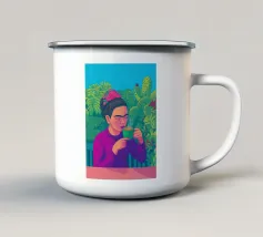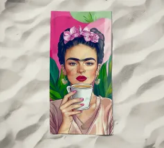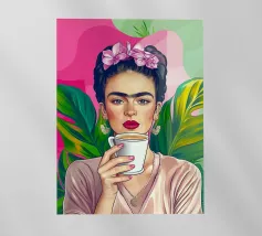Frida Kahlo gusta il suo caffè in una tazza bianca, circondata da accenti botanici. Il copricapo fiorito e le unghie rosa conferiscono al quadro una nota di allegria e celebrano il suo amore per la natura e la vita.