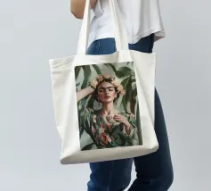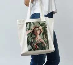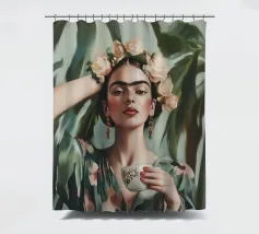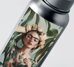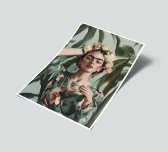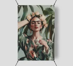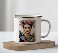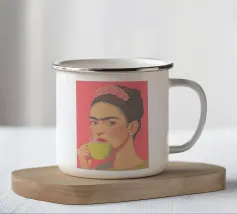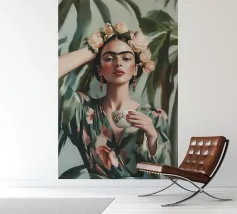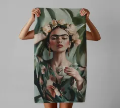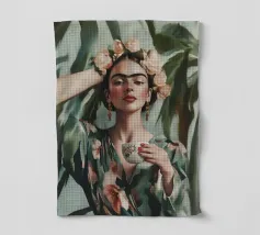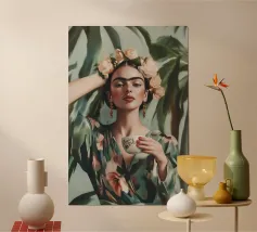 Frida Kahlo gusta il suo caffè in una tazza di fiori, circondata da elementi botanici e accenti floreali. Il suo autoritratto emana eleganza e stile boho, mentre i verdi tenui e i toni della terra sottolineano la sua bellezza naturale.