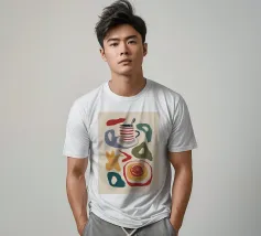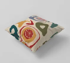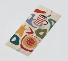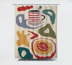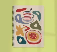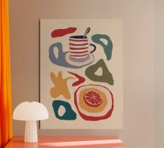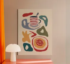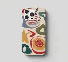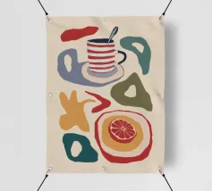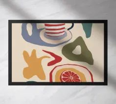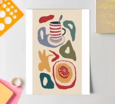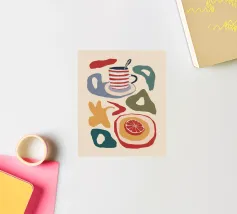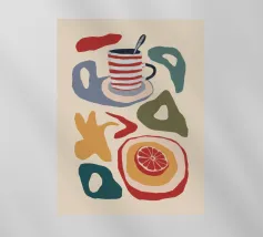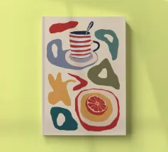 Una moderna natura morta astratta di una pausa caffè, con una tazza di caffè decostruita, una fetta di pompelmo e altre forme organiche su uno sfondo neutro.