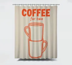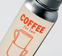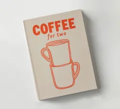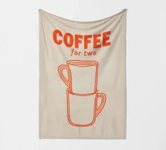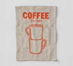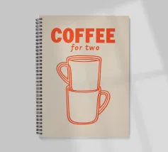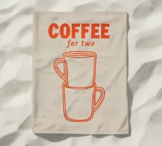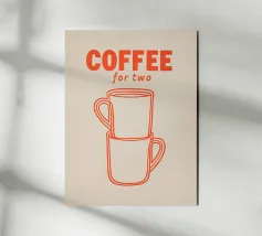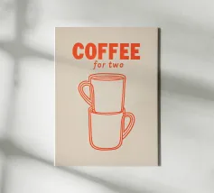 Illustrazione Due tazze di caffè: il design semplice con la scritta arancione "caffè per due" invita a iniziare la giornata insieme. Il disegno minimalista incontra i toni caldi del beige e la chiarezza tipografica: perfetto per un'elegante routine mattutina.
