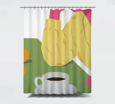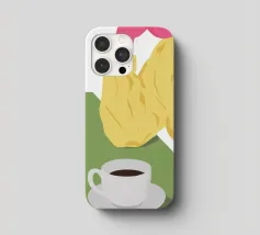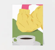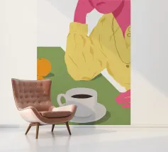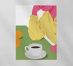 Vista dall'alto di una donna che si gode una tranquilla pausa caffè, con una tazza di caffè e un pasticcino su un piatto. La semplice composizione è una rappresentazione pacata, elegante e relazionabile di un momento tranquillo e personale.