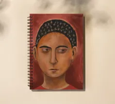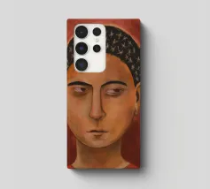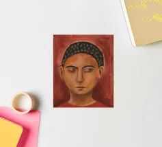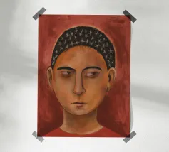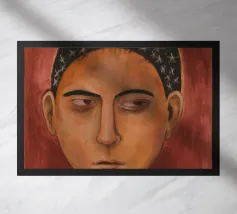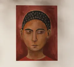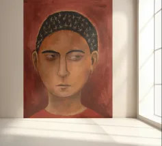 Un ragazzo con una calda camicia rossa contempla in silenzio, immerso in tonalità bronzee e semplicità grafica.