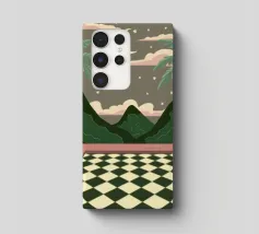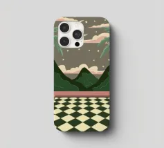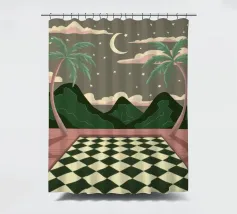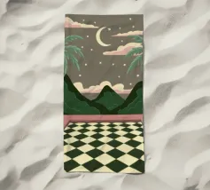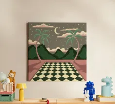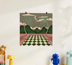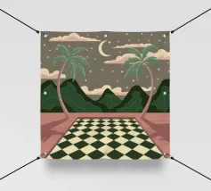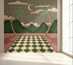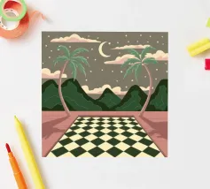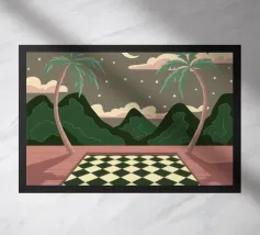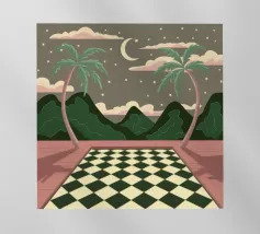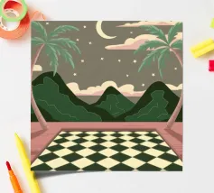 Una vista attraverso un arco di un pavimento a scacchi che conduce a una terrazza con palme sotto un cielo stellato notturno. La scena è una rappresentazione serena, elegante e magica di una tranquilla serata tropicale.