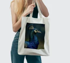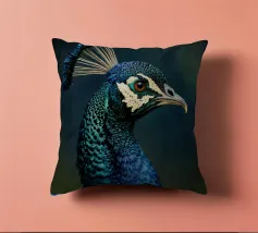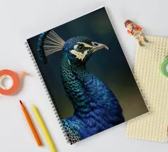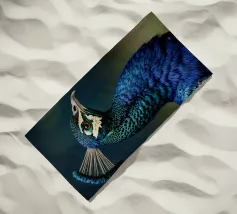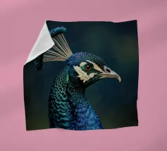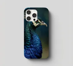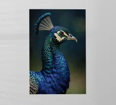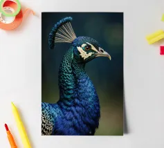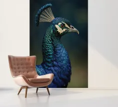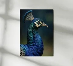 Un ritratto elegante e mozzafiato di un pavone, che mostra i dettagli intricati delle sue magnifiche piume blu e verdi. I ricchi colori gioiello e lo sguardo maestoso dell'uccello creano un senso di lusso e grazia.