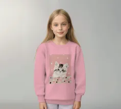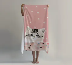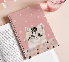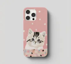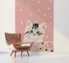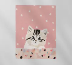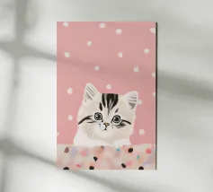 Un minuscolo gattino soriano fa capolino su un bordo di coriandoli in un colore rosa arrossato con giocosi pois. Le texture dipinte a mano in stile gouache e i tenui colori pastello conferiscono a questa illustrazione di gatto un'atmosfera moderna e scandinava: carina, tranquilla e un po' sfrontata.
