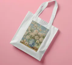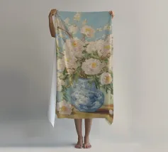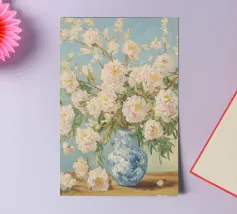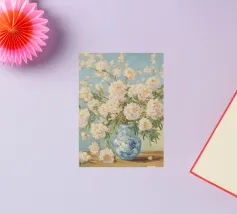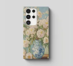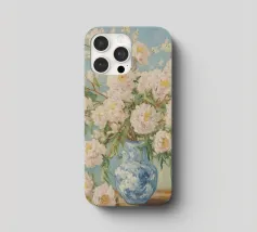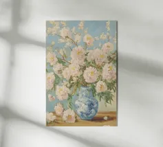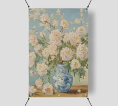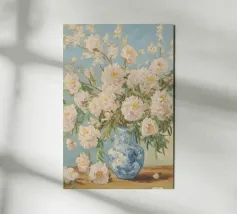 Dipinto a olio di lussureggianti peonie bianche disposte in un vaso bianco e blu a cineseria. Natura morta floreale impressionista con colori pastello tenui su uno sfondo azzurro, che cattura la delicata consistenza delle fioriture primaverili.