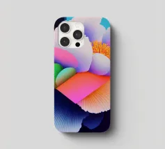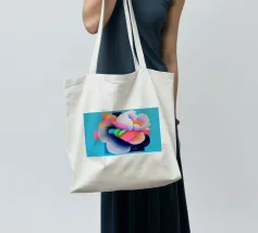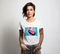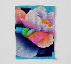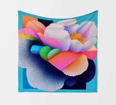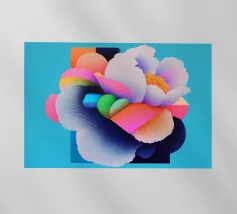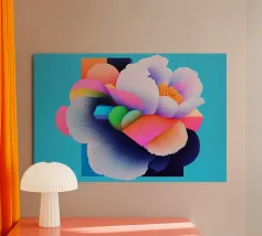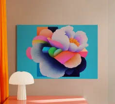 Un affascinante gioco di peonie e moderni motivi geometrici in brillanti colori al neon crea una composizione surreale e simmetrica che celebra la bellezza della botanica in modo creativo.