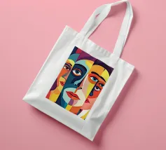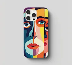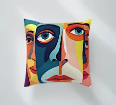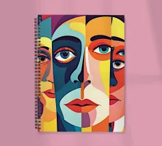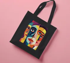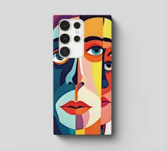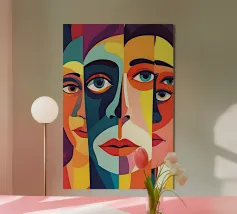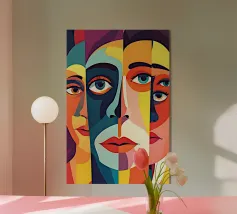 Il dipinto, orientato verticalmente, mostra una rappresentazione altamente stilizzata e sfaccettata di volti allineati e parzialmente sovrapposti. Lo stile è bidimensionale e astratto, con contorni chiari e netti e una tavolozza di colori intensi e brillanti (giallo, arancione, rosso, blu intenso, turchese). I volti sono separati e ricomposti da ampie strisce verticali di colore. Gli occhi e le labbra sono riccamente dettagliati ed espressivi. La composizione ricorda i ritratti cubisti o la pop art e celebra il dinamismo e la diversità dei volti umani.