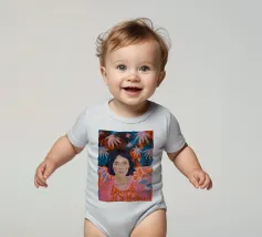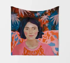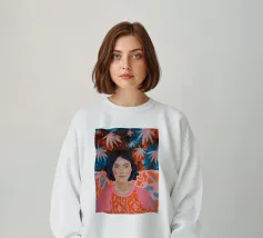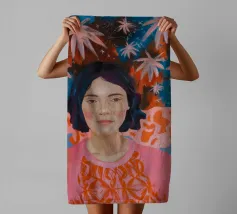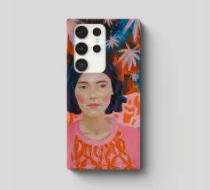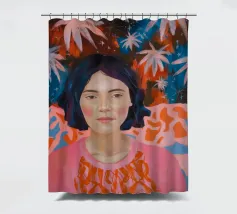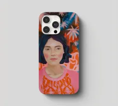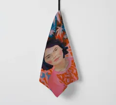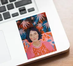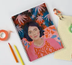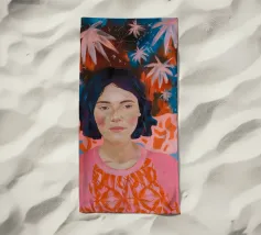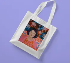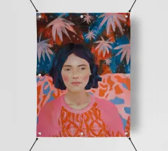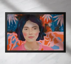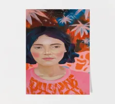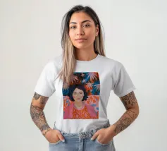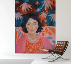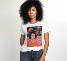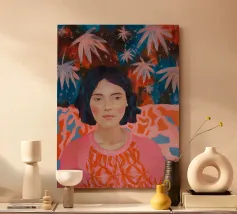 Ritratto vivace di una donna con i capelli scuri, che indossa un top a fantasia rosa e arancione, su uno sfondo di fiori o foglie stilizzati bianchi e blu a forma di stella.