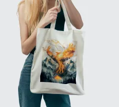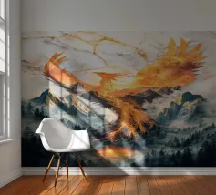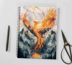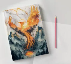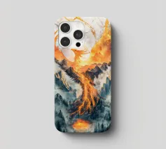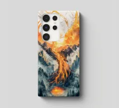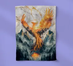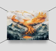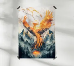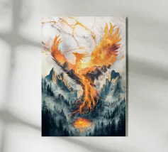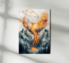 una fenice erutta da cime frastagliate come un vulcano. Le sue fiamme fuse si riversano in una nebbiosa pineta e in un lago incandescente, mentre il cielo infuocato si infiamma di rinascita.
