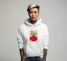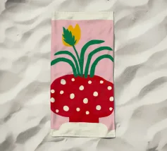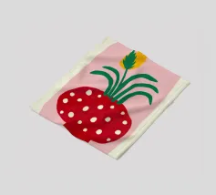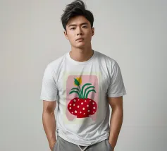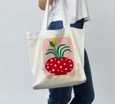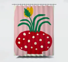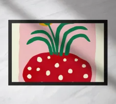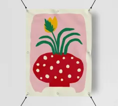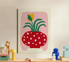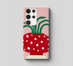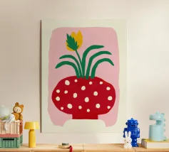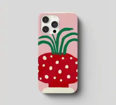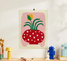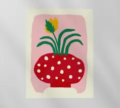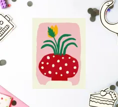 Un'illustrazione allegra e grafica di una grande pianta verde in un vivace vaso rosso ornato da pois bianchi. Su uno sfondo rosa tenue, questo pezzo è una rivisitazione moderna e giocosa dell'arte botanica.