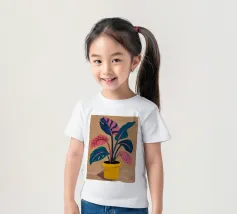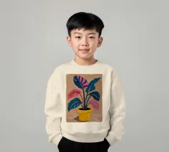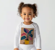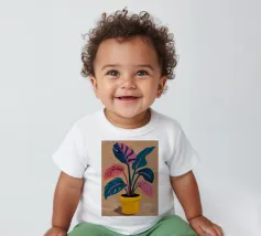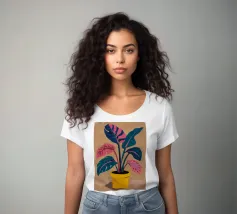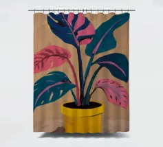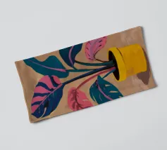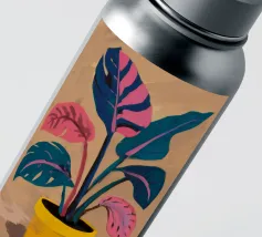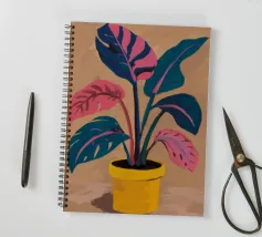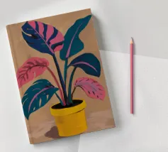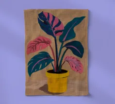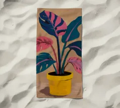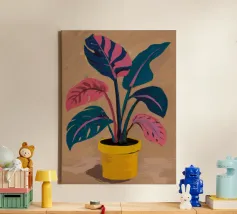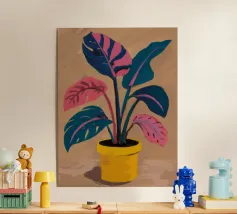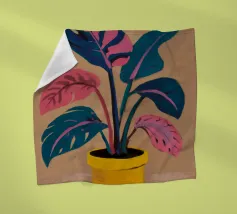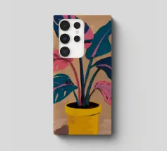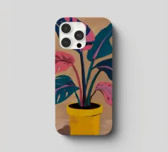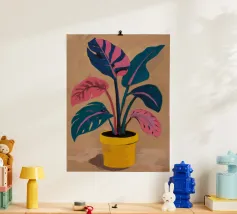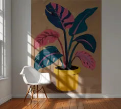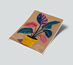 Illustrazione semplice e moderna di una pianta frondosa con foglie rosa e verdi in un vaso giallo brillante. Lo sfondo è un rosa tenue e terroso, che crea un pezzo botanico morbido, caldo ed elegante.