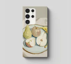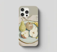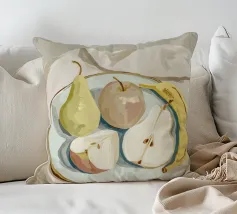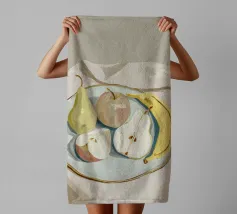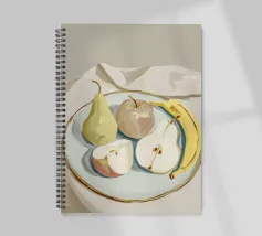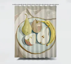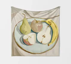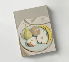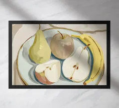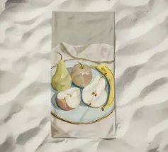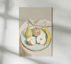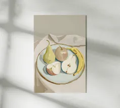 Una semplice natura morta mostra un piatto di frutta con pere, mele e banane a fette su una tovaglia chiara, vista dall'alto. I toni tenui della terra e il design minimalista conferiscono all'immagine un'eleganza tranquilla e quotidiana: un momento della cucina, catturato con colori tenui.