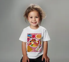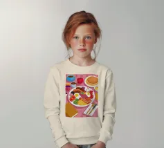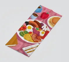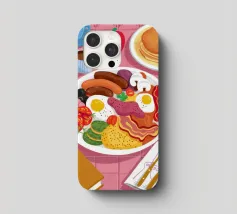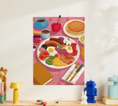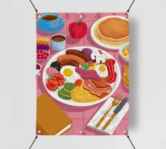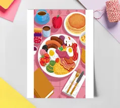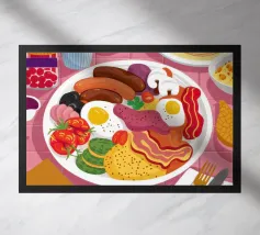 Una deliziosa illustrazione dall'alto di una colazione completa all'inglese, con pancake, uova, salsicce, pancetta, fagioli e caffè, una vera festa per iniziare la giornata.