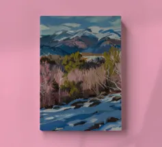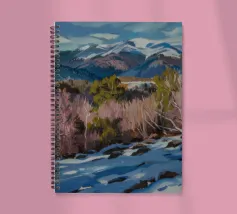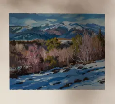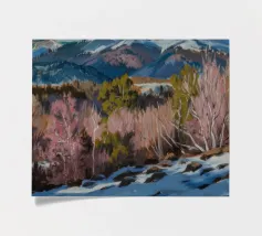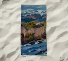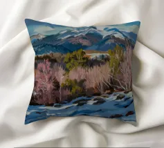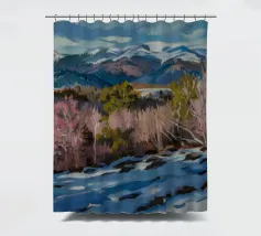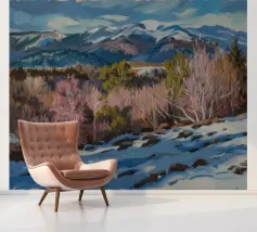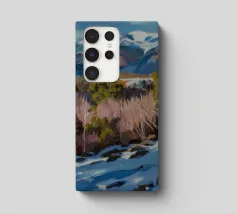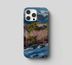 Un paesaggio aspro, caratterizzato da un fiume veloce e roccioso che si fa strada in un'ampia vallata, le cui sponde sono fiancheggiate da alberi spogli o scarsamente frondosi, che conducono verso uno sfondo di imponenti montagne innevate.