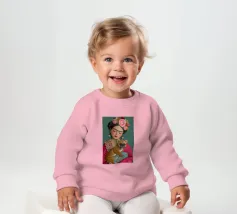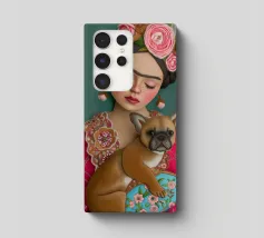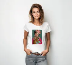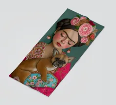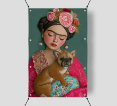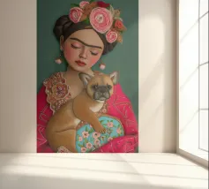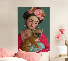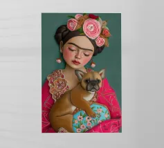 Frida Kahlo indossa la sua caratteristica corona di fiori e le sopracciglia decorate, mentre irradia un'atmosfera sognante con gli occhi chiusi. L'opera, completata dal suo cane e da elementi folcloristici, cattura l'essenza della vita di Frida in un collage creativo di colori e texture.