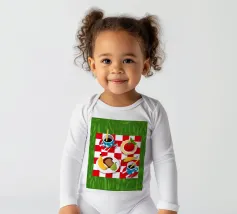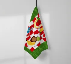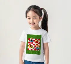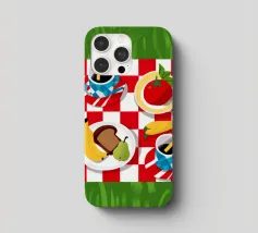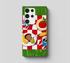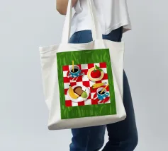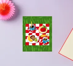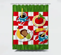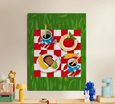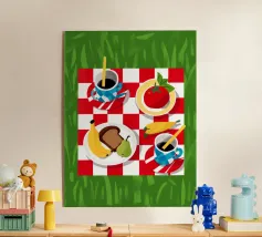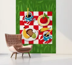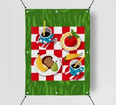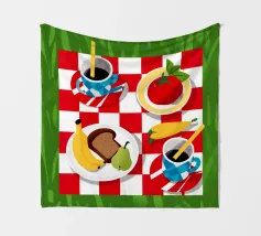 Vista dall'alto di un picnic su una coperta a scacchi rossi e bianchi, con pane, frutta e caffè. La composizione è una rappresentazione classica, affascinante e grafica di una perfetta giornata di svago.