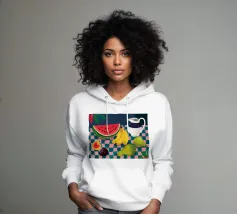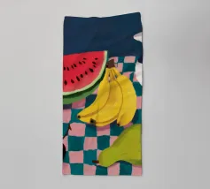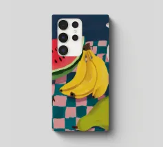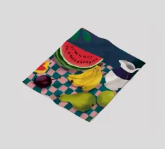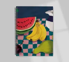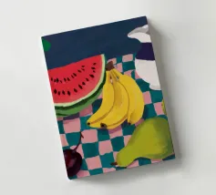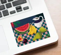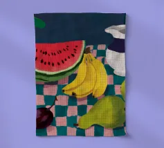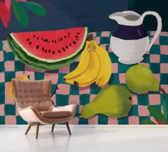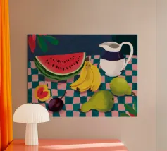 Una giocosa natura morta con una grande fetta di anguria, una brocca bianca, banane e una mela su una superficie a scacchi verdi e bianchi. La composizione utilizza audaci colori primari su uno sfondo scuro per un effetto grafico di grande impatto.