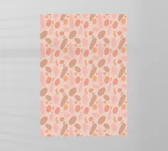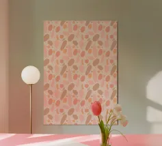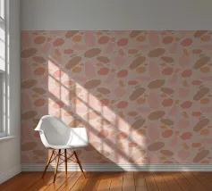 Un disegno astratto che utilizza pietre di varie dimensioni, con delicate sfumature color pesca. Le pietre, di forma irregolare e distribuite in modo fluido, creano un gioco di contrasti tra superfici lisce e ruvide, evocando una sensazione di movimento e armonia. Il colore predominante del pesca sfuma in diverse tonalità, dalle più chiare alle più intense, creando un effetto morbido e sofisticato. L'insieme è elegante e naturale, con una sensazione di equilibrio tra elementi geometrici e organici.