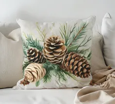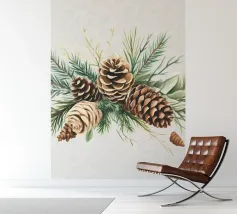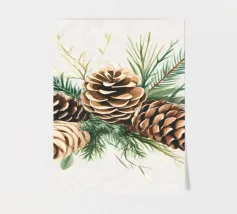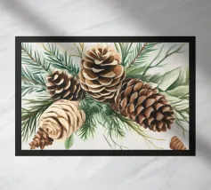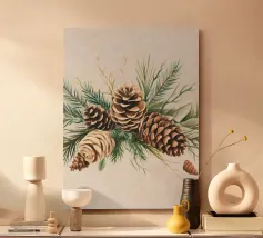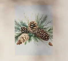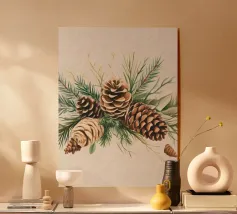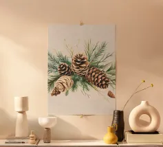 Questo elegante acquerello mostra una bella composizione di pigne e rami di abete, un classico simbolo della stagione fredda. I delicati toni verdi degli aghi si armonizzano perfettamente con i caldi toni marroni delle pigne e creano un'atmosfera naturale e rilassante. Il quadro emana freschezza invernale e fascino rustico, ideale per decorazioni natalizie, biglietti d'auguri o stampe per la casa. Perfetto per murales, cuscini, tazze, cover per cellulari, tende da doccia, magliette o poster. Coni, rami di abete, inverno, natura, acquerello, Natale, foresta.