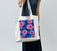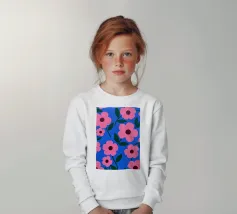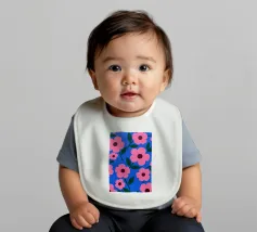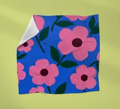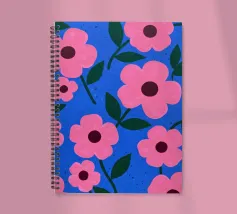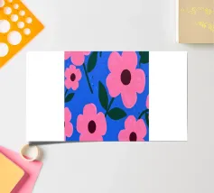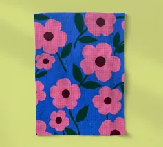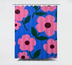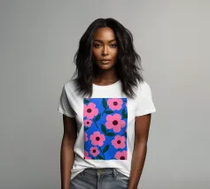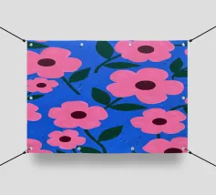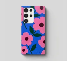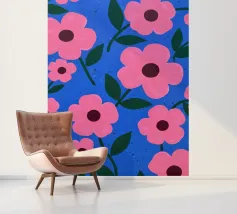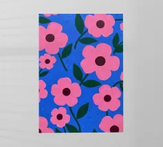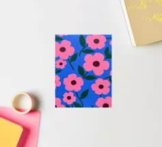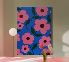Un vivace motivo senza soluzione di continuità di fiori rosa stilizzati su uno sfondo blu scuro. La composizione è un pezzo audace, moderno e bellissimo di design grafico floreale.