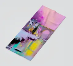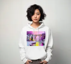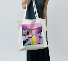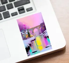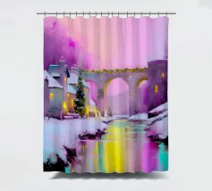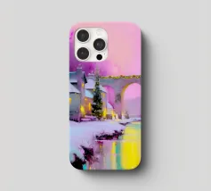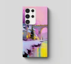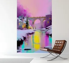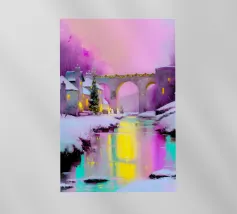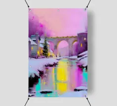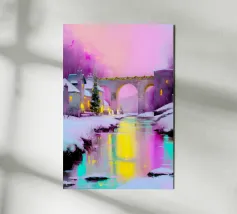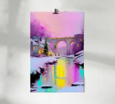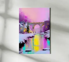 Un tranquillo villaggio invernale si raccoglie intorno a un ponte di pietra ornato di luci festose. Tetti innevati e finestre luminose costeggiano il fiume, mentre morbide pennellate e un cielo rosa al tramonto proiettano riflessi scintillanti sull'acqua.
