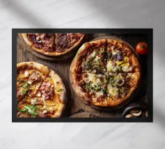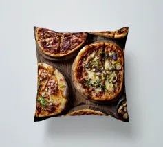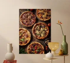 pizza tavolo in legno pomodori funghi basilico formaggio salame piccante salsiccia cipolle peperoni rucola olive erbe aromatiche carne cotta pizza a fette disposizione del cibo ambiente rustico crosta croccante varietà di condimenti pizza gourmet