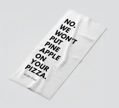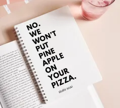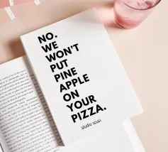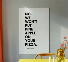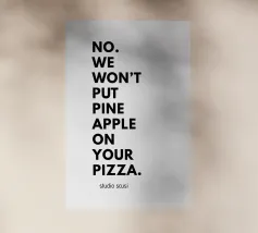 Un'affermazione chiara di cui nessuna pizzeria dovrebbe fare a meno: questo manifesto tipografico mette subito in chiaro che qui conta la tradizione - e non gli esperimenti esotici. Il testo "NO. NO. NOI NON METTEREMO LA PINOCCHIA SULLA TUA PIZZA" è scritto a caratteri cubitali neri. La divisione su più righe ha l'effetto di un ritmo forte e deciso, quasi come se un pizzaiolo italiano stesse parlando con un dito alzato. La discreta scritta "studio scusi" in basso completa il disegno con una strizzatina d'occhio ironica.