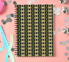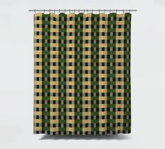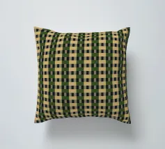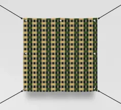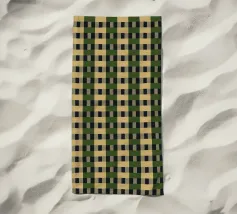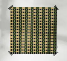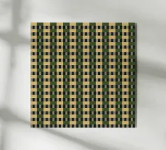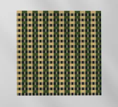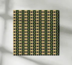 Un motivo ripetitivo di quadrati beige e verde scuro crea una griglia a scacchiera, offrendo un design simmetrico ed equilibrato. L'alternanza dei colori aggiunge profondità e ritmo alla composizione.