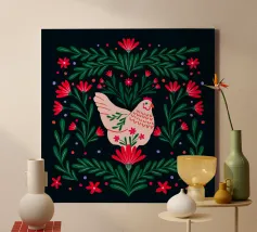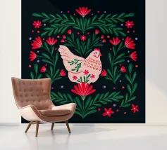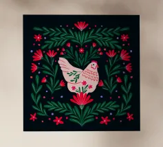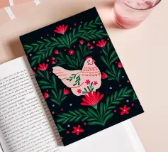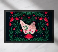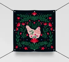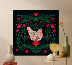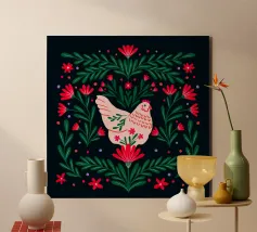 La forma delicata della gallina, abbinata al fogliame e ai fiori circostanti, crea una composizione equilibrata e ispirata alla natura, perfetta per gli amanti dell'arte che amano i pezzi unici e stravaganti.
