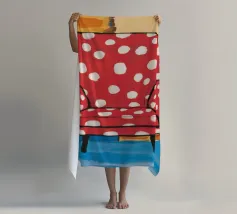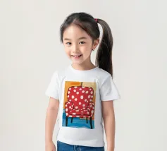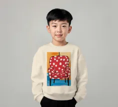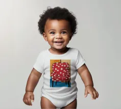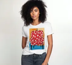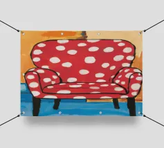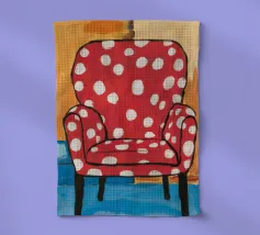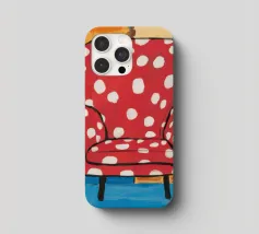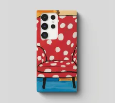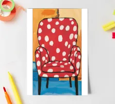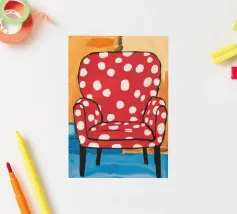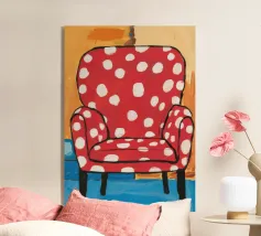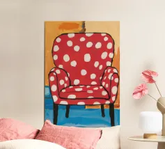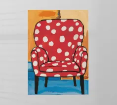 Un'audace illustrazione di una poltrona classica rivestita in un vivace tessuto rosso con grandi pois bianchi, che la rendono un pezzo divertente e giocoso.