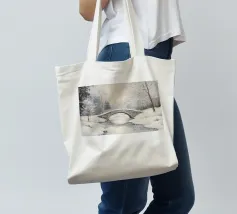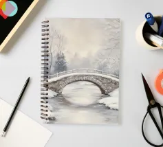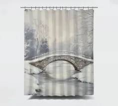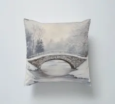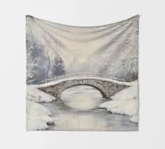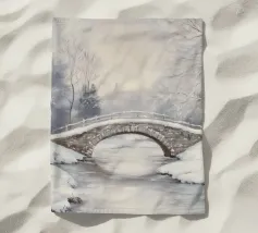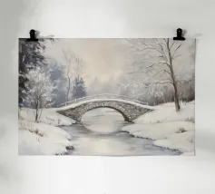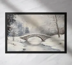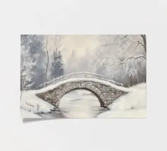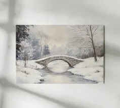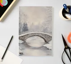Sereno paesaggio acquerellato di un ponte di pietra ricoperto di brina su un ruscello tranquillo, circondato da alberi carichi di neve nella nebbiosa luce invernale.