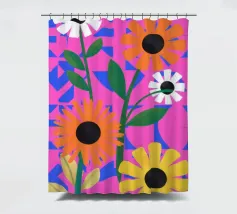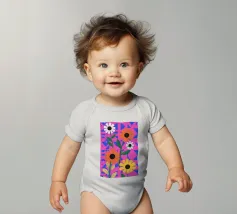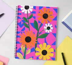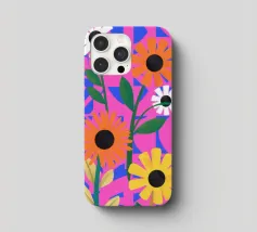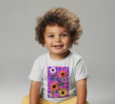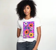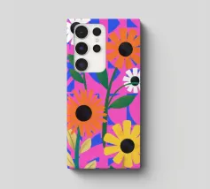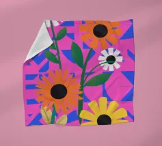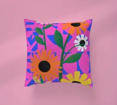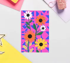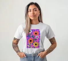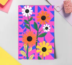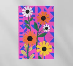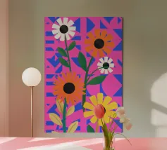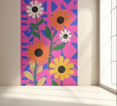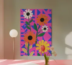 Una vivace natura morta pop art con un bouquet di margherite e girasoli su un audace sfondo a motivi blu e rosa. La composizione è una celebrazione allegra, energica e moderna del potere floreale.