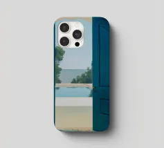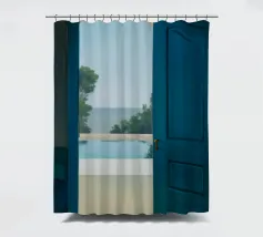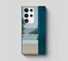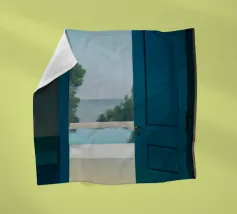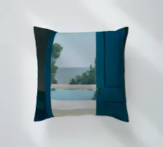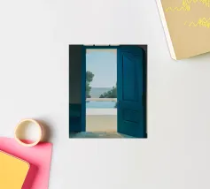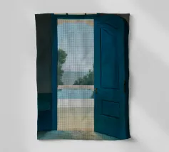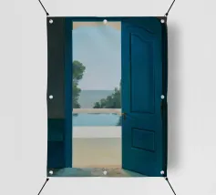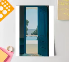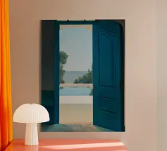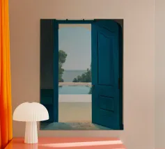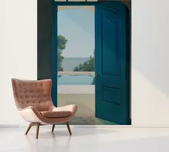Una porta blu scuro riccamente colorata si apre, rivelando uno scorcio allettante di una piscina illuminata dal sole e di un albero. Questa composizione crea un forte senso di invito, mistero e promessa di un paradiso nascosto.