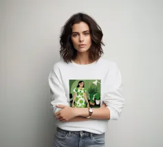 Un'allegra illustrazione di una donna con gli occhiali, che indossa un abito bianco a grandi pois verdi. È circondata da una varietà di piante d'appartamento, tra cui un cactus, a dimostrazione dell'amore per il giardinaggio indoor e di uno stile di vita da "genitore di piante".