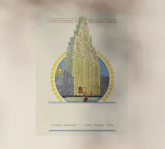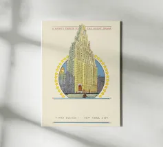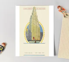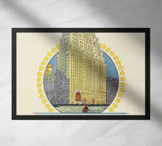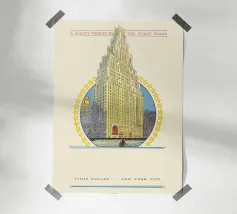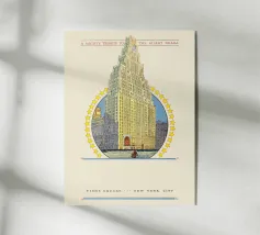 Tornate all'epoca d'oro del cinema con questo affascinante poster d'epoca che celebra il Paramount Building a Times Square, New York. L'illustrazione dettagliata raffigura l'iconico grattacielo Art Déco, coronato da una torre dell'orologio e da un arco stilizzato, circondato da un anello di stelle. Il testo "A Mighty Tribute to the Silent Drama" (Un potente tributo al dramma muto) colloca questo pezzo nel contesto storico dei primi film. Questo poster digitale di alta qualità (7000x5000 pixel, 300 dpi) conserva magnificamente il fascino storico e l'eccellenza artistica dell'originale. È un pezzo perfetto per gli amanti della storia del cinema, di New York C
