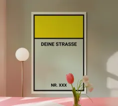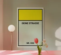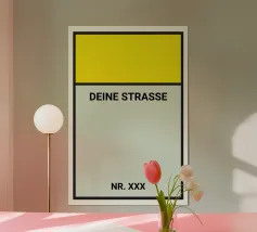 Un classico reimmaginato: questo poster personalizzabile con il look delle leggendarie strade del Monopoly porta divertimento e personalità alla vostra parete. Con la strada preferita e il numero civico individuale, è un originale richiamo visivo, sia come regalo di benvenuto, sia per la prima casa o semplicemente come divertente dichiarazione per la vostra casa. Ideale per gli appassionati di videogiochi, per le famiglie o per le pareti di un appartamento. Disegnate subito online e decorate con umorismo!