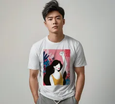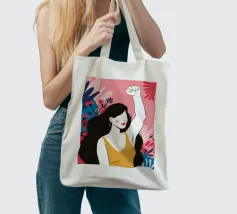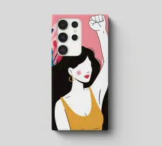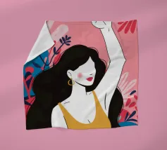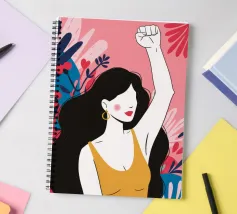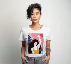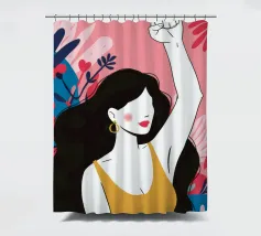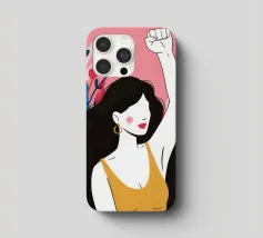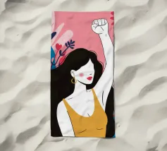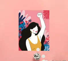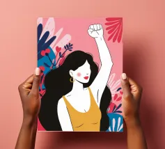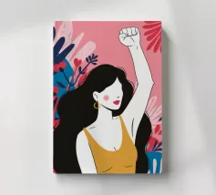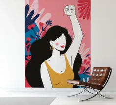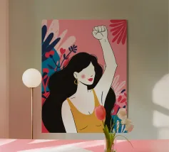 Illustrazione di una donna dai lunghi capelli scuri che alza in aria un pugno di sfida, circondata da fiori. L'immagine è un simbolo potente e bellissimo di forza, protesta ed emancipazione femminile.