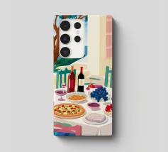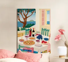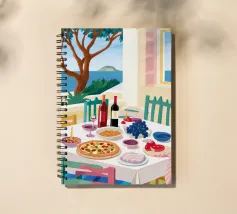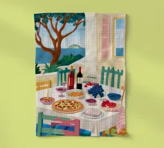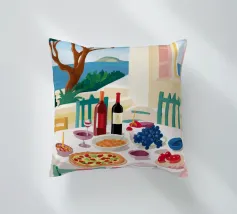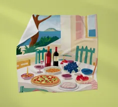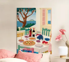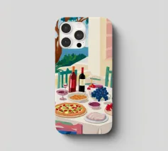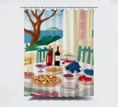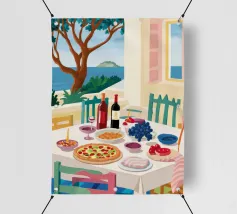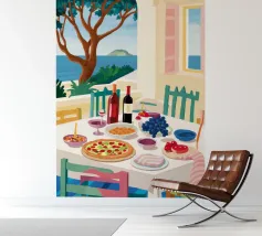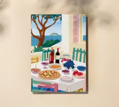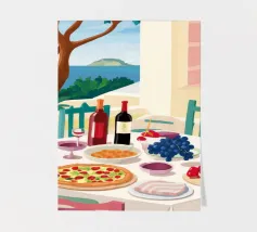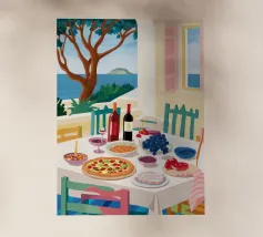 Un pranzo sulla terrazza costiera con pizza, vino e frutta si affaccia sul mare blu scintillante.