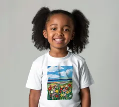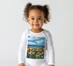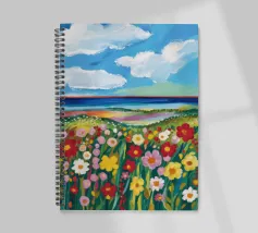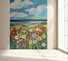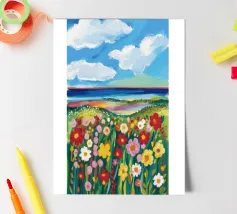 Un paesaggio impressionistico cattura un prato mozzafiato di fiori selvatici colorati che sbocciano su una scogliera che si affaccia su un mare azzurro e sereno sotto un cielo estivo, creando una scena di pura bellezza naturale.