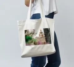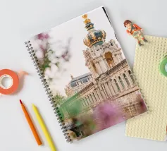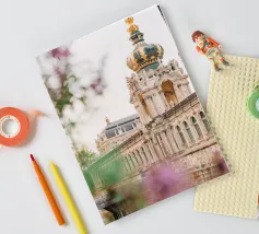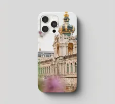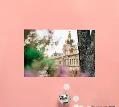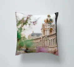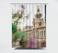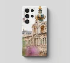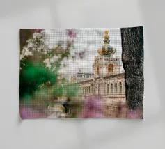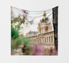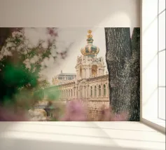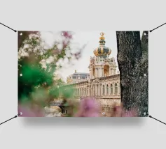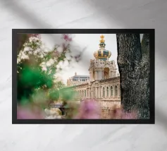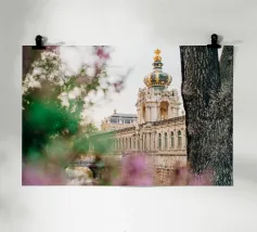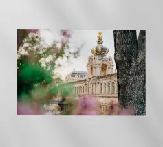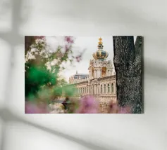 Fotografia dello Zwinger di Dresda in primavera. Fotografata attraverso i rami in fiore, l'immagine mostra l'architettura barocca con una luce morbida e colori caldi. Un motivo armonioso tra storia e natura.