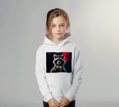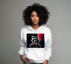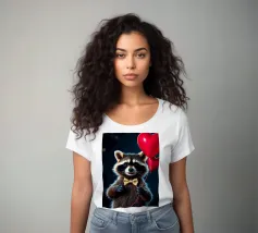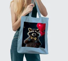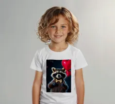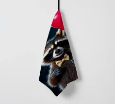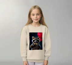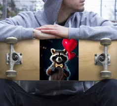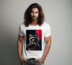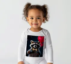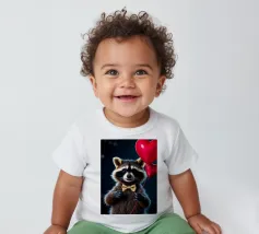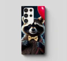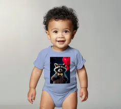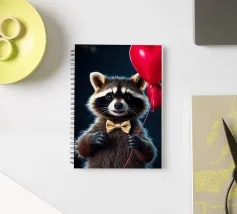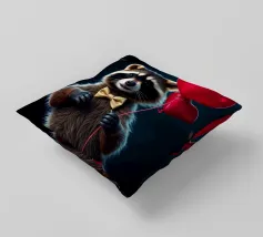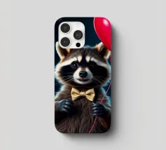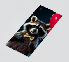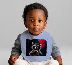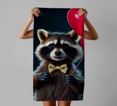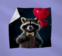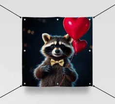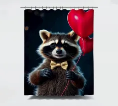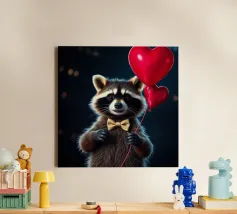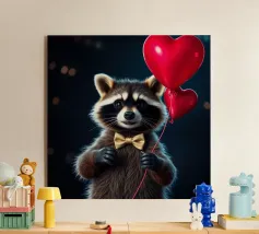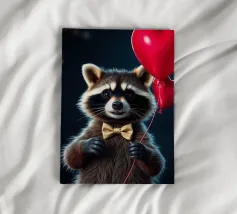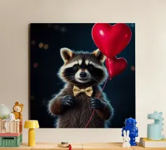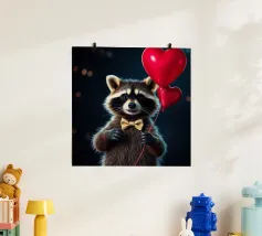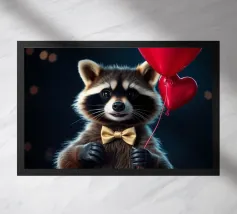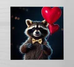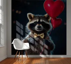 Un procione che indossa un papillon dorato si erge allegro mentre tiene in mano un palloncino rosso a forma di cuore. Lo sfondo è caratterizzato da luci scintillanti che creano un'atmosfera festosa.