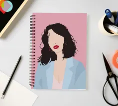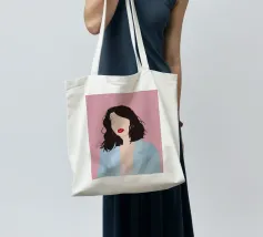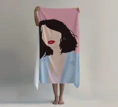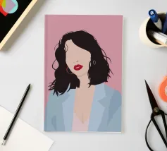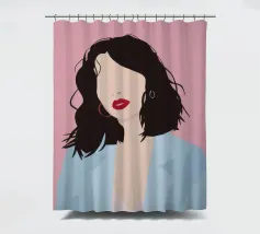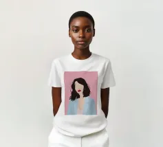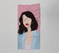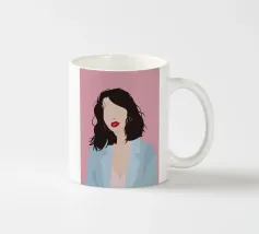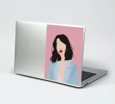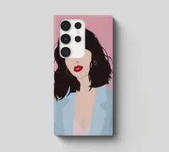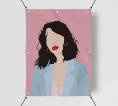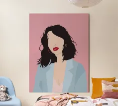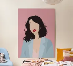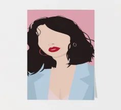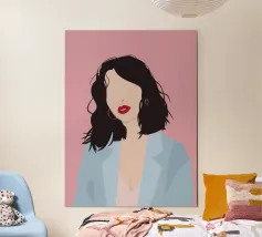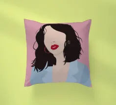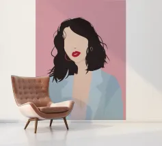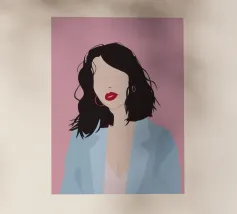 Una donna senza volto con rossetto rosso e capelli neri sciolti posa con sicurezza su un rosa tenue.