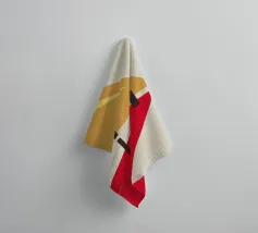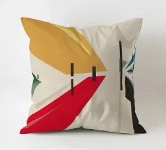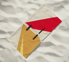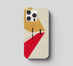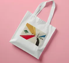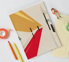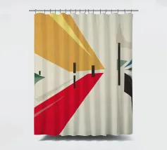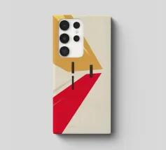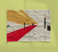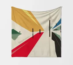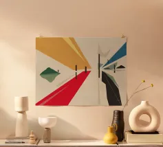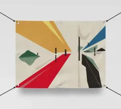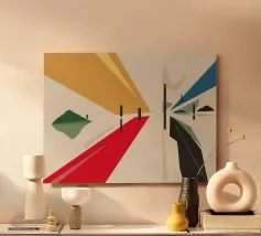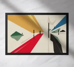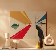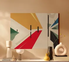 Forme geometriche audaci e linee vibranti convergono verso un punto centrale, creando un suggestivo senso di profondità e movimento. Diverse tonalità di rosso, giallo, blu e verde interagiscono con forme astratte che ricordano montagne e pali.