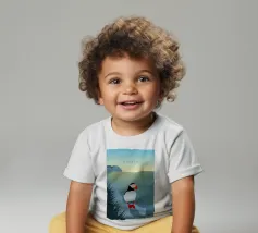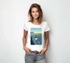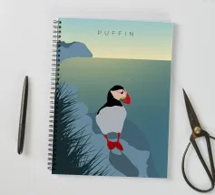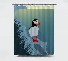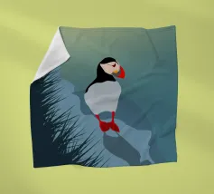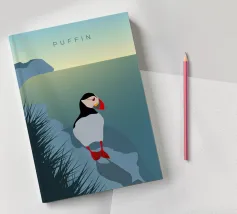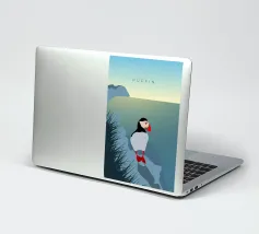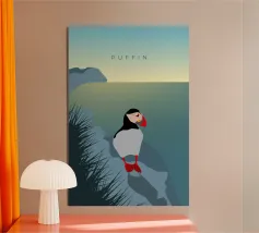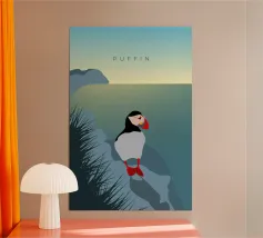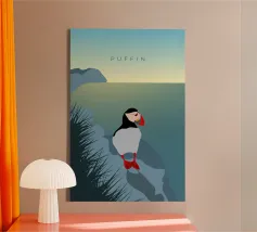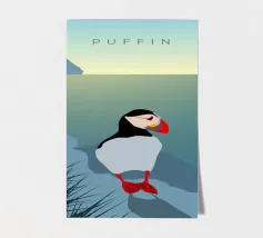 Un design di viaggio minimalista con un simpatico pulcinella di mare o puffin sul paesaggio costiero dell'Islanda.